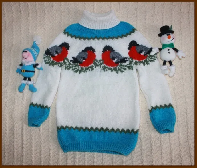 Увидела в интернете детский свитерок со снегирями от Елены Жигановой и сразу загорелась связать такой же....Небольшое описание было,но явсе пересчитывала под свою плотность размер.Картинку частично вывязывала,частично вышивала.Показываю свою работу и всю информацию от автора дизайна,какую нашла в интернете-кратеое описание,картинку свитера с размерами автора и схемку птичек...