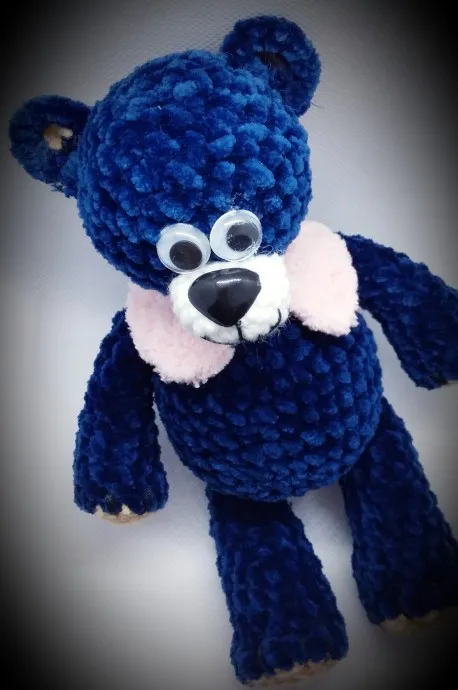 - Решила связать из велюровой пряжи. Получился такой мишка.