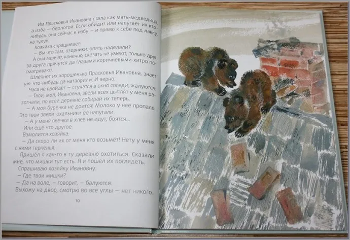 Живут медвежата целый день на воле. В лес бежать и не думают. Им Прасковья Ивановна стала как мать-медведица, а изба — берлогой. Если обидит или напугает их кто-нибудь, они сейчас в избу — и прямо к себе под лавку, на тулуп.