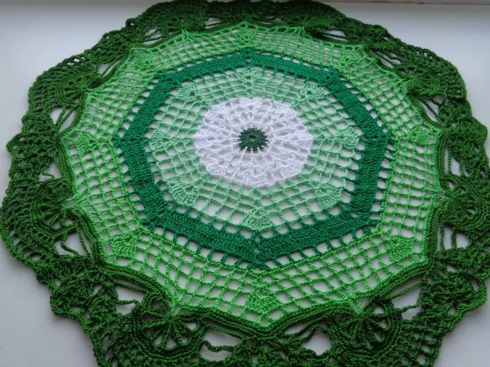 Очень люблю зелёный цвет во всех его оттенках (у меня глаза зелёные )Салфетка поразила своей необычной схемой и чудесными переходами оттенков зелёного. Высший балл!