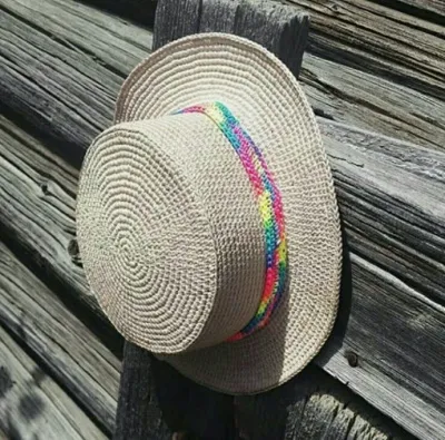 Форму хорошо держит как раз достаточно жёсткая пряжа, плюс возможно ввязывается ещё для формы как правило регилин (в случае на фото может и нет, но в шляпки частенько в край полей, очень много пересмотрела на ютюбе видео МК). Ну и плюс форма, куда надевать шляпку по готовности, опять же накрахмалить любым способом. Рада, если чем-то помогла