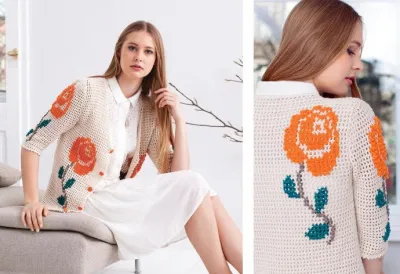 Благодаря стежкам крестом из пушистой фасонной и объемной фитильной пряжи цветочные мотивы на этом простом жакете получаются пластичными и выразительными.