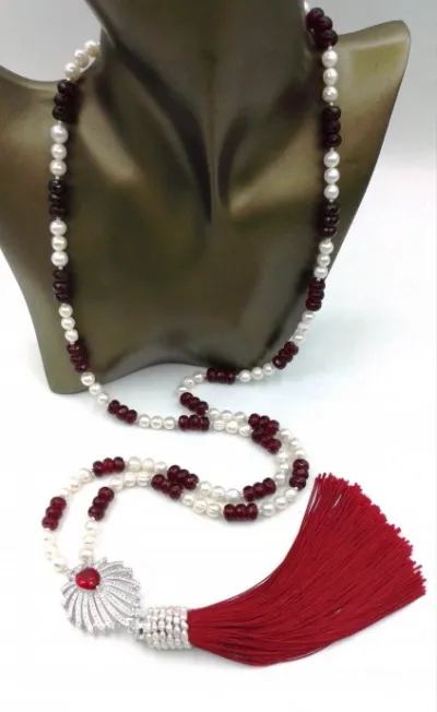 Шикарные, длинные бусы - сотуар изготовлены из натурального белого Жемчуга (7 мм), граненого Рубеллита в виде ронделей (8 х 5 мм) красивого винного цвета и сверкающей подвески с микро цирконами, родиевым покрытием,ювелирного качества LUX,производство Ю.Корея. В центре подвески расположен искусственно выращенный Рубин,прекрасно сочетающийся с Рубеллитом и . шелковой кистью такого же цвета.Кисть в верхней части декорирована натуральным Жемчугом.