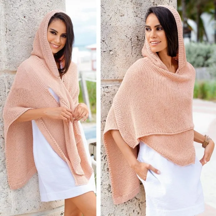 Удобная накидка-пончо с капюшоном не сползет с плеч благодаря специальной прорези, через которую можно продеть оду из половинок модели.