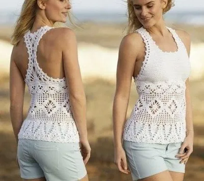 Топ состоит из нескольких деталей, сначала выполняется вязание передней верхней части, потом бретельки майки и после этого вяжется задняя часть. После этого выполняется основная деталь вязанием по кругу.