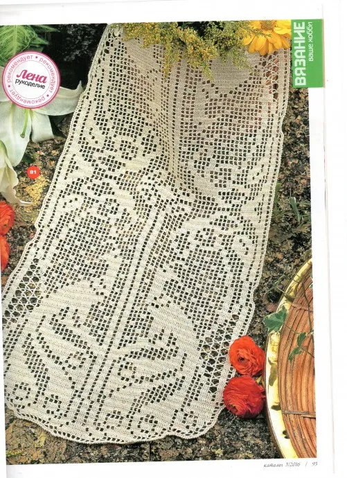 Эту салфетку я вязала из пряжи Coco 50г/240м У меня ушло 3,5 мотка. Размер получился 48*108 см. Взято из журнала "Мое любимое рукоделие" каталог №3/2016