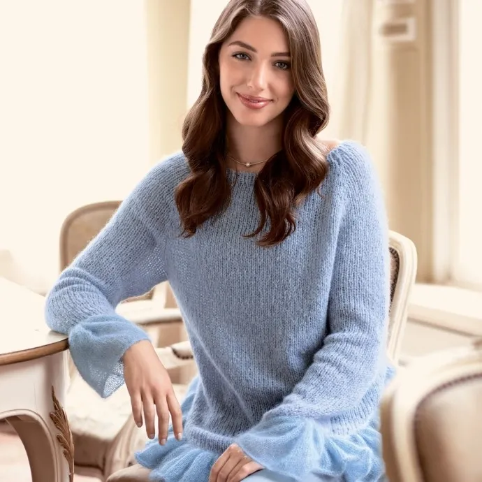 СБОРКА Вшить рукава. Оставленные петли — по 40 (42 – 44) 48 п. переда и спинки и по 16 (18 – 20) 24 п. рукавов = 112 (120 – 128) 144 п. перевести на круговые спицы № 3,5, сине-серой нитью вязать резинкой, при этом в 1-м круг.р. кромочные провязать вместе с предыдущей или следующей петлей (= убавить 8 п.) = 104 (112 – 120) 136 п. Через 4 круг.р. выполнить пришитый край на всех петлях. Выполнить боковые швы. По нижнему краю набрать на круговые спицы №5 светло-синей нитью 352 (376 – 400) 424 п., замкнуть в кольцо. В 1-м круг.р. удвоить все петли = 704 (752 – 800) 848 п., в следующем круг.р. удвоить каждую 2-ю п. = 1056 (1128 – 1200) 1272 п., после 22-го круг.р. свободно закрыть все петли. Выполнить швы рукавов, волан рукава пришить к нижнему скошенному краю рукава.