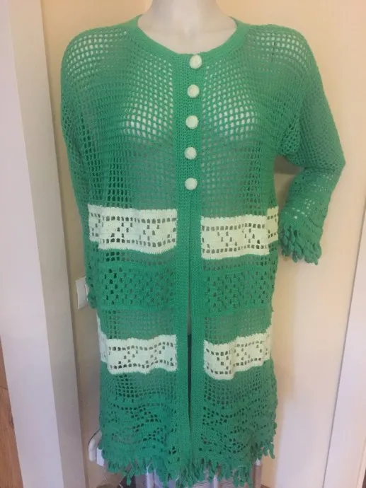 очень милый кардиган! цвет мятный нынче в тренде. Много времени ушло на его вязание?