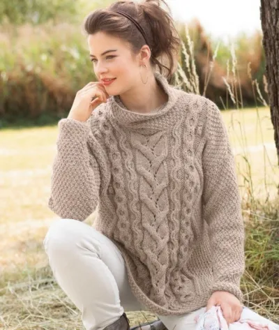 Свитер-оверсайз с роскошными «косами», которые особенно удачно смотрится на фоне простого жемчужного узора.