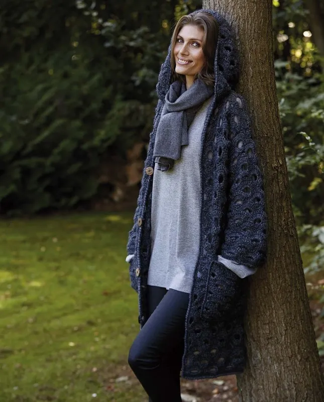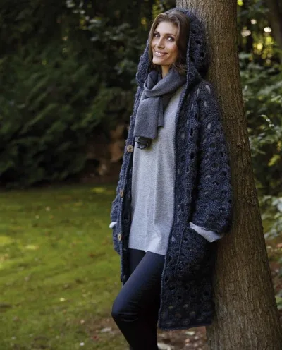 Свободный кардиган с застежкой на пуговицы, большими карманами и объемным капюшоном.