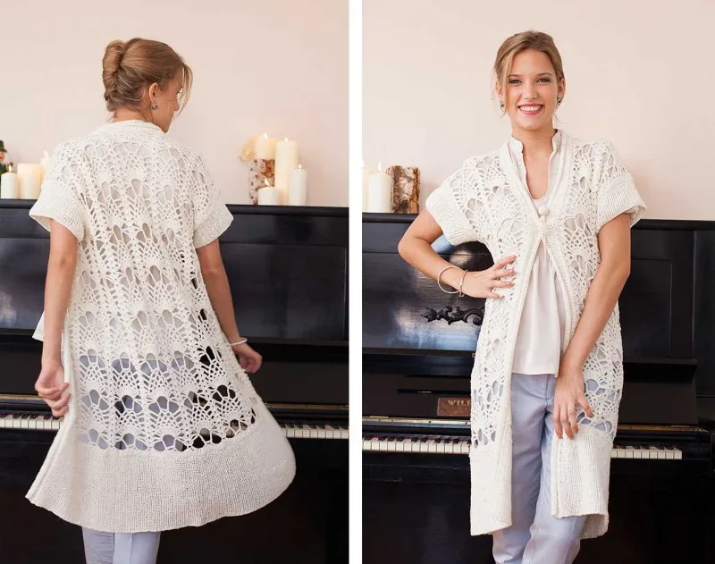 Ажурная часть шикарной длинной накидки связана узором «ананасы», а после проймы и низ изделия обвязаны на спицах гладью и резинкой.