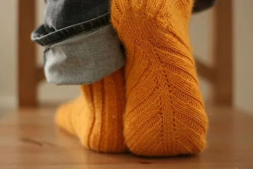 Основной особенностью этих носков является то, что они вяжутся по косой. Поэтому носок менее эластичный, чем обычные носки, связанные по прямой, но он лучше сидит на ноге.