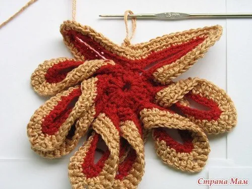 Получилось 9 листочков, повернуть их все налево, обвязать контрастной нитью, начав с середины (с верхушки лепестка) и закончить там же, соединив по кругу все лепестки. На верхушке лепестка вязать 15 ст. б/н.
