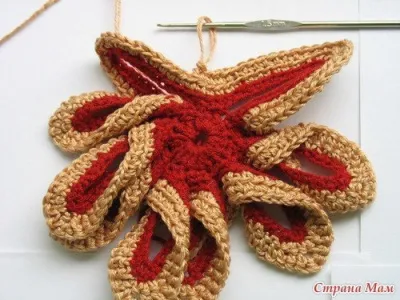 3-й ряд: На 1-м ст. с/н предыдущего ряда* связать петлю из 23 в. п., соединить в тот же столбик, 1 ст. б\н*, получится 9 длинных петель и 1 ст. б/н между ними