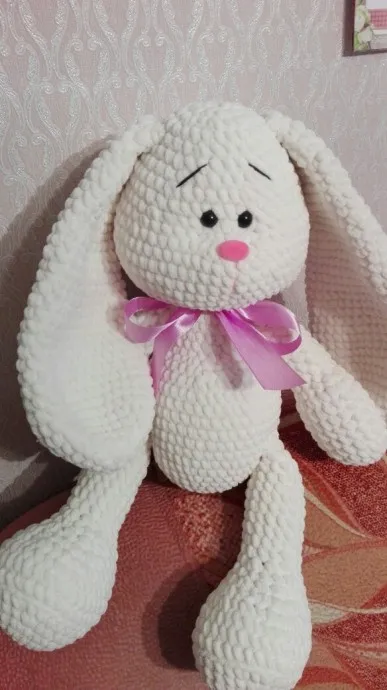 Зайка из пряжи Велюр (Ярн Арн и Карпту) цвет молочный. Крючок 4. Набивка синтепух. Бархатный носик на безопасном креплении и глазки бусинки, так же на безопасном креплении.