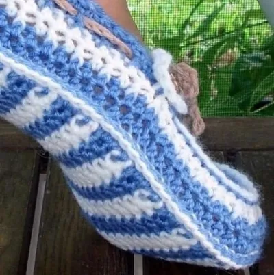 Мысок Набираете 8 петелек. 1 ряд: во 2 петлю от крючка ваш первый стбн, остальные петли сбн до конца ряда. 2 и все последующие ряды вяжите стбн, при этом не забывайте делать воздушную в начале каждого ряда. Когда свяжете нужной вам длины, обвяжите по кругу точно, как обвязывали подошву, только в уголках провяжите в одну петлю по 2 стбн. Это для того, чтобы произошло закругление. Я не пришиваю, а провязываю соединительной петлей за обе петли, которые на язычке и на основе, то есть на боковой части. 8 петелек — это для всех размеров, а вот длину подбираю сама. По описанию вы должны провязать 11 рядов по 7 стбн и потом обвязать, как я уже и говорила раньше.