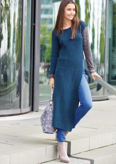 Необычное асимметричное платье с очень высоким боковым разрезом и одним рукавом отлично смотрится с узкими джинсами!