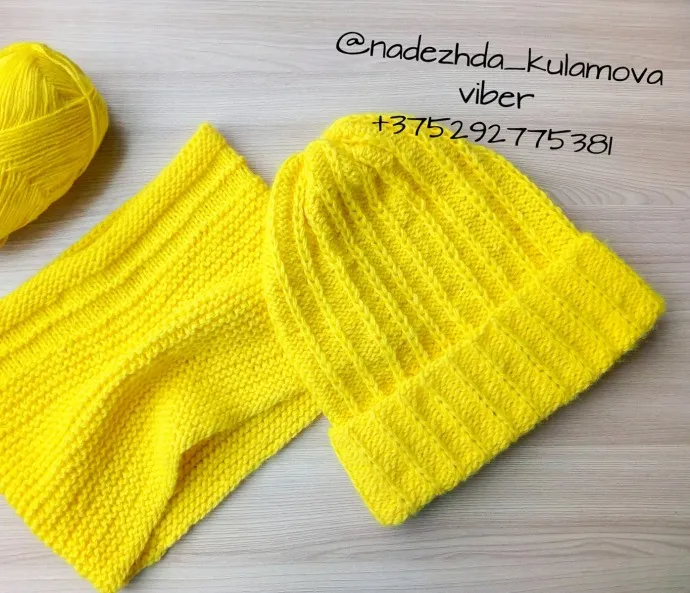 схемы нет, шапка связана изнаночной гладью с вытянутой лицевой петлей 3 через 1, снуд платочной вязкой по кругу