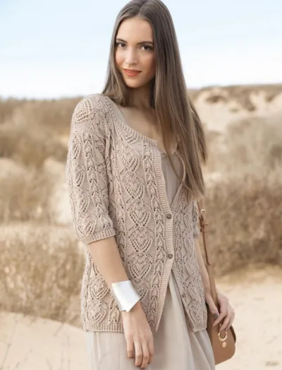 ВАМ ПОТРЕБУЕТСЯ Пряжа (100% хлопка; 180 м/50 г) — 350 (450) 500 г песочной; спицы №3; круговые спицы №3; 5 пуговиц (размер 12 мм).