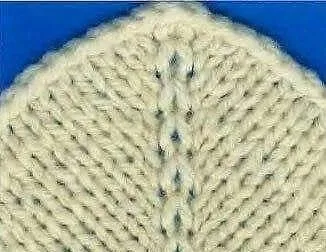 Разделяющая полоса между прибавляемыми петлями вправо и влево может состоять из изнаночной петли (рис. 1), содержать несколько изнаночных петель и быть дополнена (украшена) узором (рис. 2) или состоять из лицевых петель . Перед лицевой петлей следует выполнять воздушную петлю елевым поворотом, а после лицевой петли — воздушную с правым поворотом. Поэтому при вязании рукавов для образования боковых скосов после кромочной следует прибавлять петли с правым поворотом, а перед кромочной — с левым.