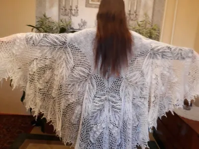 Вот я ее и связала!!! Просто мечту свою воплотила. Кайму правда сама решила изменить в отличие от изначальной, и вот в итоге что получилось. Пряжа — кид-мохер в одну нить, вес 165 г, ушло больше 3-х мотков (в 50 г. — 500 м); размеры: по ленточке — 240 см, по центру — 120 см. Не судите слишком строго — это всего лишь третья моя шаль. Еще петли не совсем ровные, плохо владею спицами.