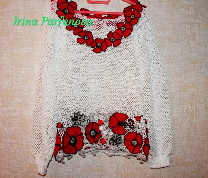 Какое прекрасное декоративное решение с маками! А под эту сверхажурность топ или тонкий пуловер с рукавом: белый/черный/красный.