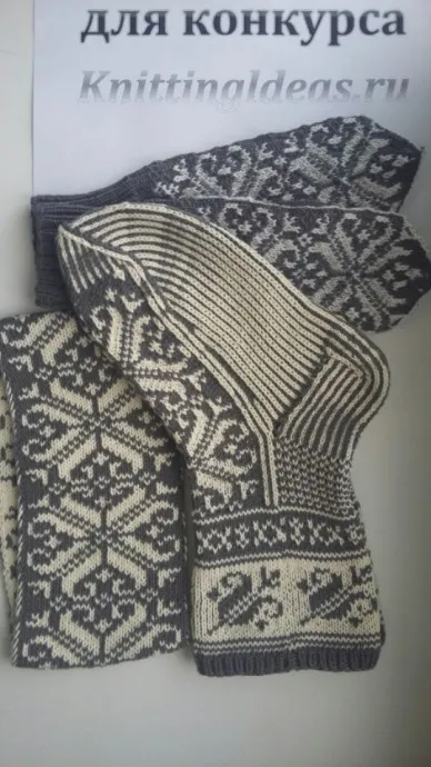Комплект состоит из повязки на голову связанной двойным жаккардом. Носок и варежек связанными жаккардом без протяжек.