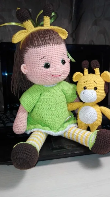 Пряжа, тело моя любимая Газаль беби котон, цвет персик. Платье из пряжи Белла хлопок. Глазки на безопасном крепления. Набивка синтепух. Кукла ростиком 40см. И друг Жирафик 7 см.
