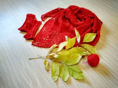 Продолжаю уничтожать запасы пряжи) На этот раз придумался и связался вот такой комплект из небольшой шали и митенок, ярко - красного цвета. Шаль связана крючком из очень простых, но, тем не менее, очень красивых мотивов, "фишечка" этой шали - красивая узкая кайма с шишечками по краю) митенки связаны спицами и обязаны сверху и снизу такой же каймой, как и шаль. Пряжа турецкая, Ярн Арт голд, 400 метров в 100гр,ушло 300 грамм. Пряжа очень красивая, с люрексом, переливается и поблескивает. Мотив и узор с митенок, а также схемку каймы - тоже прилагаю, вдруг кому захочется попробовать повторить)