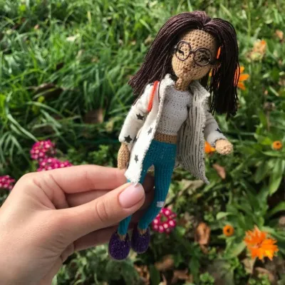 Портретная куколка,стоит устойчиво без опоры за счёт каркаса и плотной набивки.Высота 14 см.Связана крючком 0,6 нитками ирис.Личико -вышито.Съёмные:блейзер,обувь,рюкзак,очки.