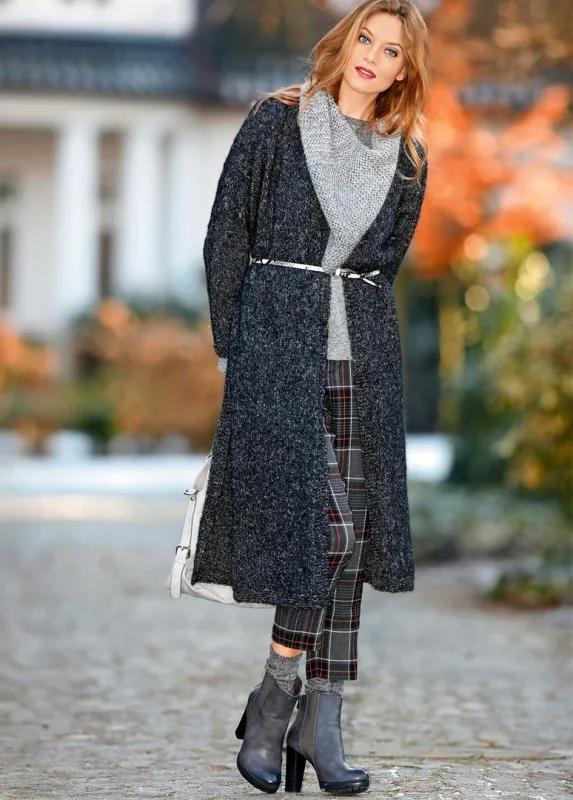 Для пальто: пряжа (26% шерсти альпака, 21% шерсти, 18% полиакрила, 18% полиэстера, 11% шелка, 6% полиамида; 160 м/50 г) — 450 (500) 550 (600) г гранитно-серой; спицы №4,5.