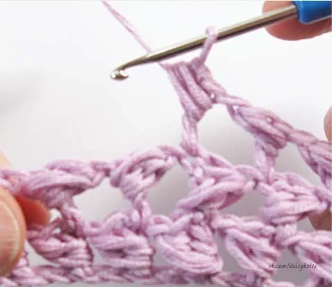 Выполнить 1 воздушную петлю, 1 петлю предыдущего ряда пропустить и повторять от шага