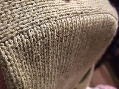 "Склоны" оката пришиваем матрасным швом. Но поскольку по самому окату идут убавки, иглы втыкаем со смещением вправо или влево на одну петлю в зависимости от того, правый или левый "склон" пришиваем, фото №7. В результате выглядит так, фото №8.