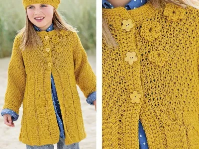 Пряжа (50% мериносовой шерсти, 50% полиакрила; 80 м/50 г) 450 (500) 550 г желтой; спицы №5,5; крючок №5; 3 пуговицы; 1 вспомогательная спица.