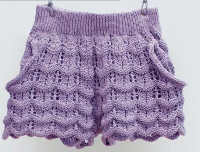 ПоясТеперь можно одеть петли на круговые спицы, распустив вспомогательную нить. Начинаем вязать пояс. Тут тоже есть нюансы. Если ваши шортики неглубокие или у вас небольшая разница между талией и бедрами, то просто начинаем вязать резинку. Провязав до желаемой высоты резинки, провяжите один ряд лицевыми, так чтобы изнаночные протяжки были с лицевой стороны пояса и свяжите еще столько же. Этот лицеой ряд сломает рисунок и сформирует край. Не стягивая, максимально свободно закройте петли и пришейте к изнанке. Если у вас высокие шортики или большая разница между талией и бедрами то, надо сделать немного припосадку – равномерно убавьте петли в первом ряду и продолжайте вязать, как описано выше.