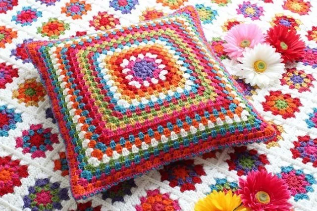 Подушки крючком из «Бабушкиного квадрата» является отличной альтернативой знаменитым пледам или коврам. Здесь нет ничего сложного в вязании, а преимуществом выступает возможность избавиться от многочисленных остатков пряжи. Для вязания квадрата используется стандартная схема, а комбинирование цветов происходит по желанию. Далее предлагается подборка подобных подушек, на основании которой вы можете придумать свой вариант с учетом имеющегося интерьера.