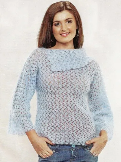 Очень интересный и в то же время легкий для исполнения ажурный узор, с которым справится даже начинающая вязальщица, а также очень простая выкройка делают вязание этого пуловера сплошным удовольствием.