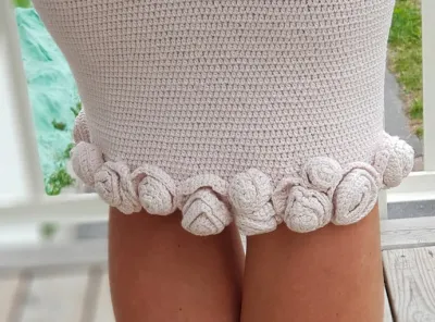 Вы крючком умеете вязать? Если да- начните вязать юбку любым столиком по кругу. То же самое с топом. Розы; 30 п. или больше по желанию, провяжите один ряд или два, сверните в Роуз сшейте низ, и шпандорте на изделие.
