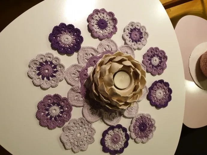 Уже соединила, обвяжу и выставлю, если нитки закончатся, цель израсходовать нитки. Мы не в восторге от фиолетового.