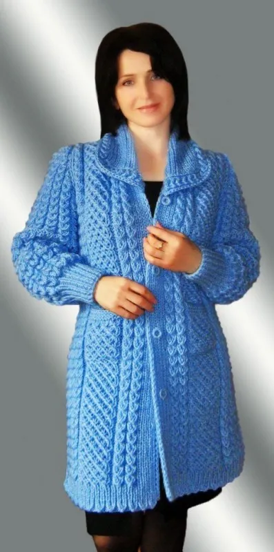 Обхват бедер — 104 см. Длина изделия — 87см. Потребуется около 1600 г объемной акриловой или полушерстяной пряжи (150 м/100 г), спицы №3,5 — 4, пуговицы (или пластмассовые кольца для ручного изготовления пуговиц).