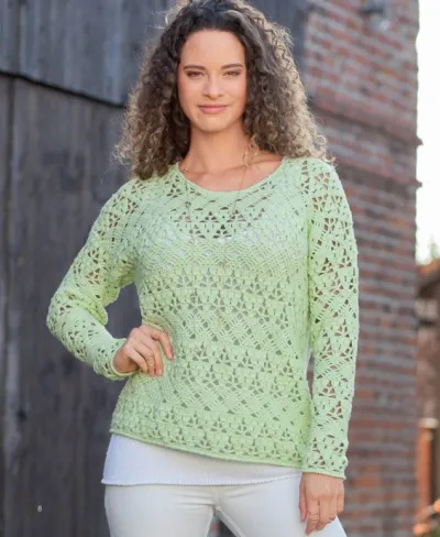 Свяжите этот пуловер из пряжи нежного цвета молодой листвы, чтобы встретить весну в «правильном» наряде. А на лето можно выбрать и другой вариант.