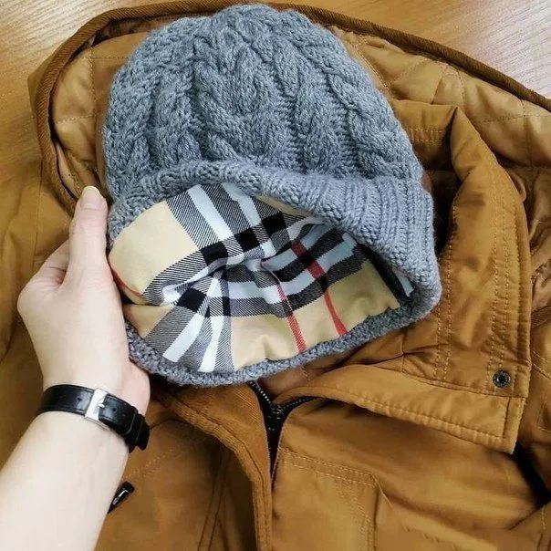 На согнутую в колене ногу натягиваю изнанкой вверх вязаную шапку, сверху натягиваю подкладочную шапку (фото показывать не буду, стыдно))), но до края шапки оставляю около 1-2см (чтобы подклад не выглядывал из под шапки – см.фото). Далее подгибаю край подклада внутрь и прикалываю булавками/иголочками. Если подклад толстый, например, толстый флис, то подгиб делать не надо, иначе у вас вязаная шапка будет отставать от головы как горшок. Таким образом получается равномерно распределить подклад по шапке, т.к. (обратите внимание!!!) подклад имеет большую окружность, чем вязаная шапка, из-за разной эластичности материалов. Далее пришиваю потайным швом тонкий подклад за подгиб, и обычным швом через край, если используется толстый флис. Можно изначально прихватить стежками макушку и по затылку (вдоль единственного длинного шва на подкладе). Успехов!)))