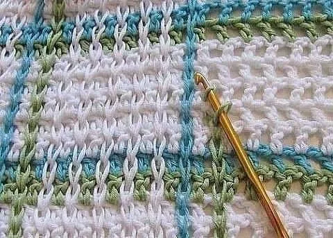 При этом цепочки могут быть выполнены цветами, отличными от основного полотна. Можно сочетать несколько цветов сразу. Тогда получится интересная полоска. А если основное полотно связано полосами разных цветов, то выйдет очень милая клетка, как на фото.