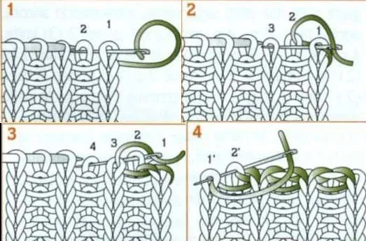 Ввести иглу в петлю 1 спереди назад, затем в петлю 3 сзади наперед, так соединены 2 лицевые петли (рис.2).