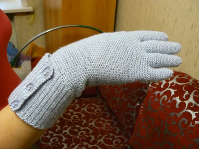 Технические данные: ниточки Пехорка Элитная Серия Австралийский меринос, 400 м в 100 гр, 95% мериносовой шерсти, 5% леакрила, цвет 195 Незабудка; крючок 1,5. Вязались достаточно быстро, в 1 ниточку, расход приблизительно грамм 150 на обе перчатки.