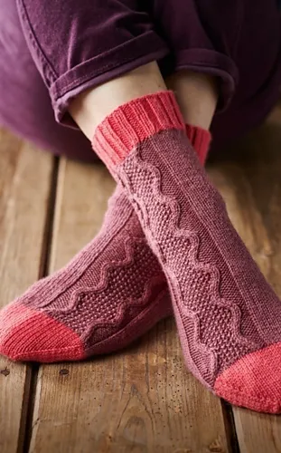 2-й круговой ряд: продолжать вязать рисунком петли верхней части стопы, лицевые петли до конца ряда.