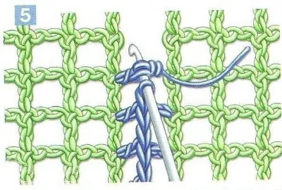 5. Соединение деталей, выполненных филейной сеткой сложите две связанные детали изделия лицевыми сторонами внутрь, вытяните петлю из начальной петли первой детали и провяжите 2 воздушные петли, накиньте нить на крючок, введите его в соответствующую петлю второй детали и провяжите столбик с накидом, закрыв его вместе с воздушной петлей, находящейся на крючке; 2 воздушные петли, неполный столбик с накидом на уровне следующего соединения филейной сетки первой детали и неполный столбик с накидом на уровне следующего соединения филейной сетки второй детали; провяжите вместе 3 петли, находящиеся на крючке , повторите от до по всей длине.