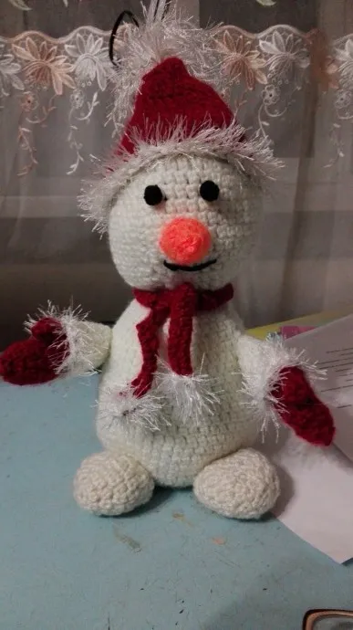 В прошлом году вязала в школу сыну для выставки. Получился вот такой снеговик.