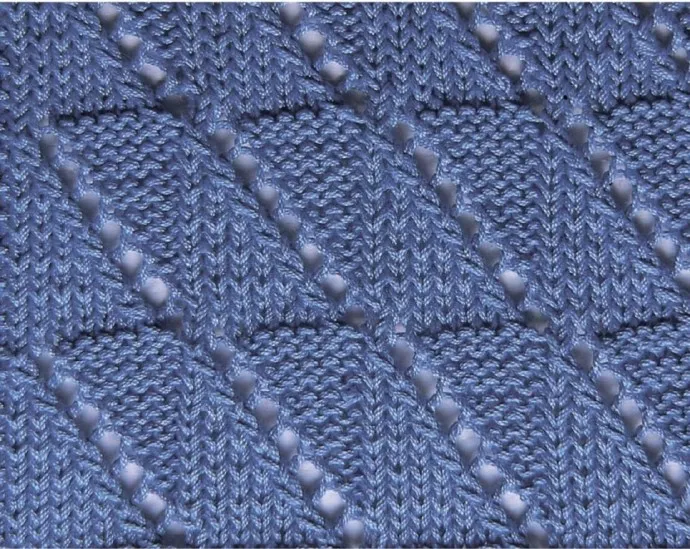 5-й ряд: * 2 изнаночные, 1 накид, 2 п. провязать вместе с наклоном влево, 4 лицевые, от * повторять.