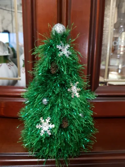 Елочка связана для украшения школьного кабинета, а именного для учительского стола. Пряжа "травка". Внутри картонный конус, набитый смятой газетой. Конус просто обвязан и украшен